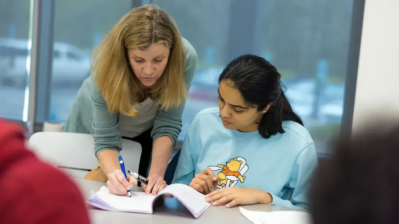 Senior Professor of Business Administration Dr. Kelly Markson works with a student in an economics class. (Court Johnson/Wake Tech)