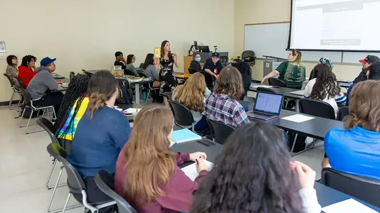 Although she recalls drawing up lesson plans on a toy chalkboard and passing out copies of National Geographic as textbooks to a group of imaginary students as a child, Trent says she never envisioned a career in teaching. But after a series of uninspiring desk jobs, she felt called to be in front of a classroom. She worked for a few years in adjunct teaching jobs in three counties, including at Wake Tech, before the college hired her full time in 2018.