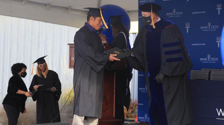 Wearing masks and practicing social distancing, students walked across a stage in their cap and gown and took ceremonial photos with Wake Tech President Dr. Scott Ralls and other college leaders while their family members applauded and cheered proudly from their vehicles. Each graduate was allowed one vehicle of family and friends. The ceremony was also streamed on Facebook Live so other relatives and friends could watch remotely.